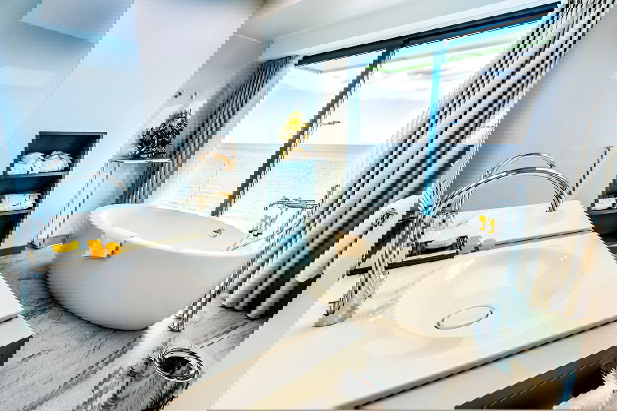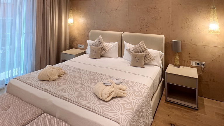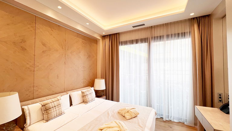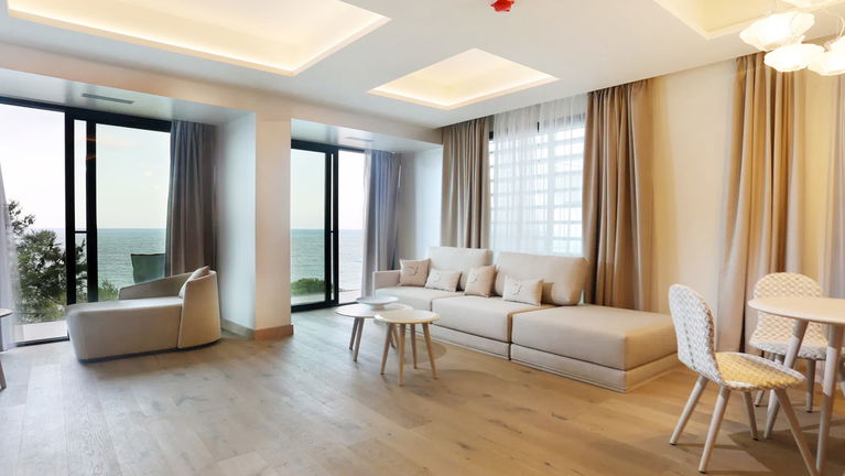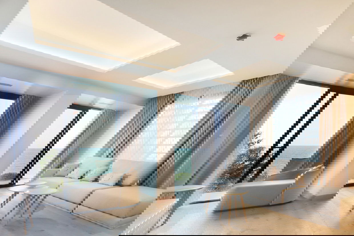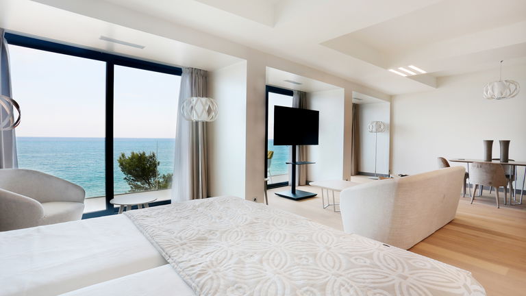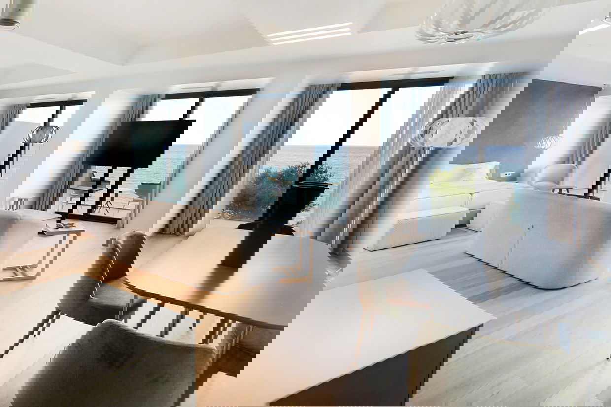 Our exclusive 90 m² apartments combine comfort, elegance, and stunning sea views. Each features a spacious living room with a double bed, a separate bedroom with two twin beds, a fully equipped kitchen, and a bathroom with a freestanding bathtub. Private terraces offer breathtaking views. Ideal for up to 4 guests - perfect for families, couples, or small groups.