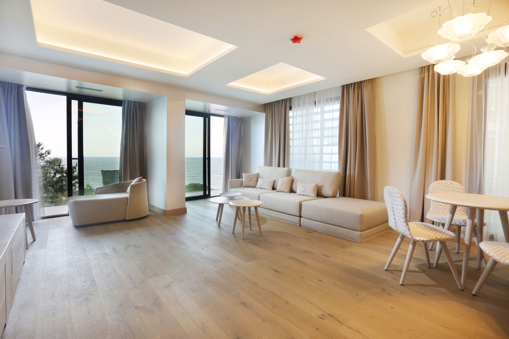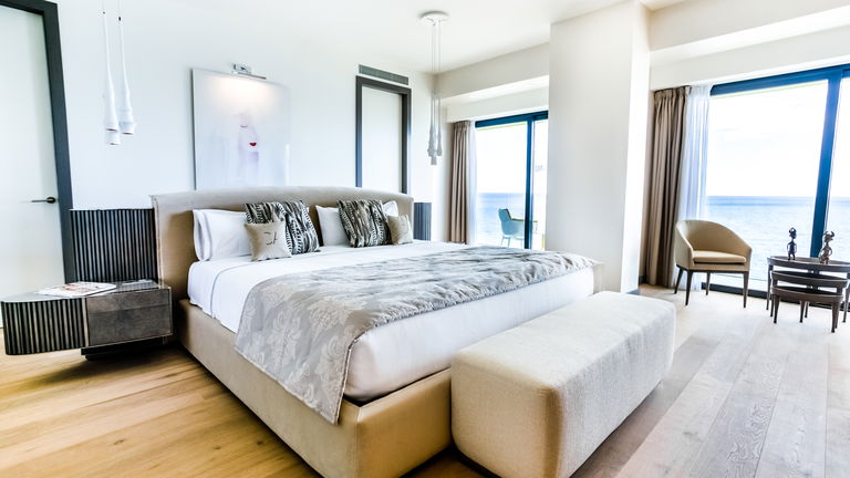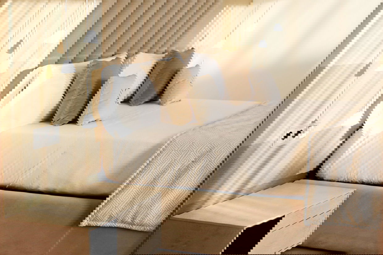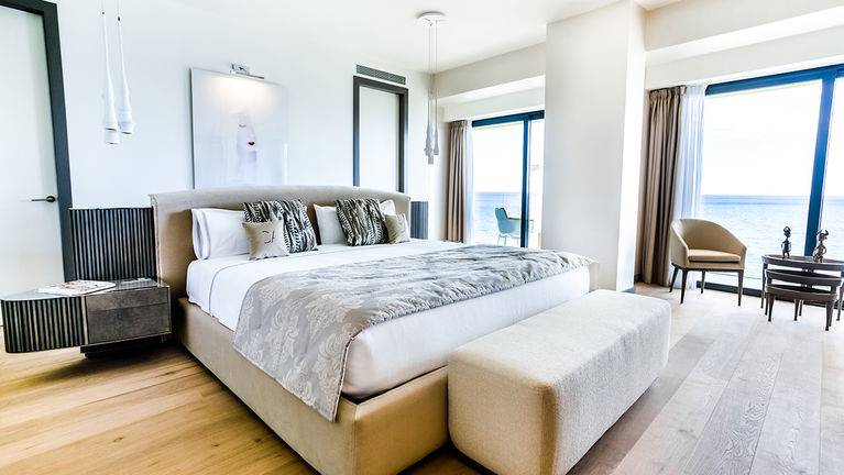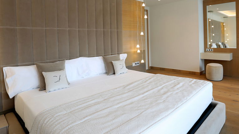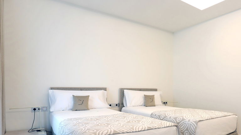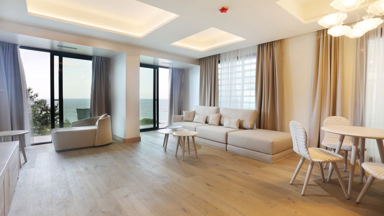 Spacious two-bedroom apartments (115–120 m²) with two private terraces, one offering stunning sea views. Includes a living room with kitchen, one bedroom with twin beds and private bathroom, and a master bedroom with a double bed, en-suite bathroom (shower & bathtub), and dressing room. Ideal for up to 4 guests.