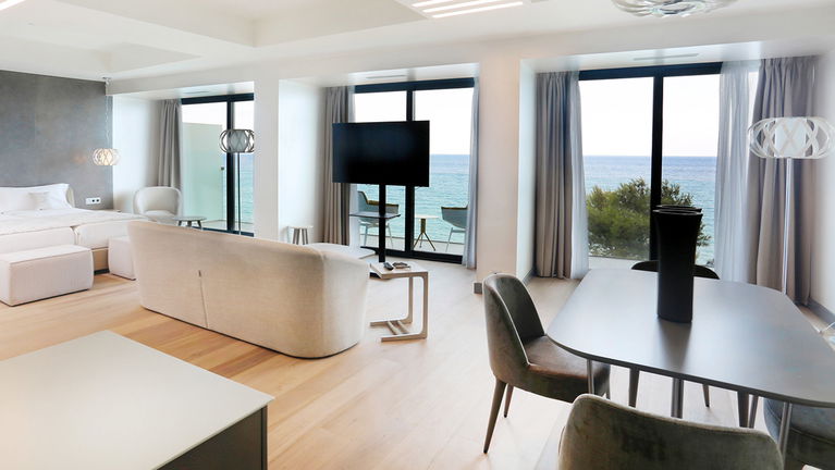 Experience the perfect blend of luxury and comfort in our elegantly designed studios. Each studio (45–67 m²) features a private terrace with stunning sea views, a fully equipped kitchen, a double bed, and a modern bathroom with a shower or freestanding bathtub. Ideal for 2 guests seeking a peaceful and stylish seaside retreat.