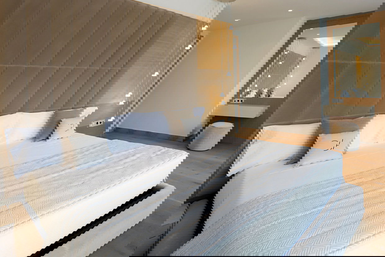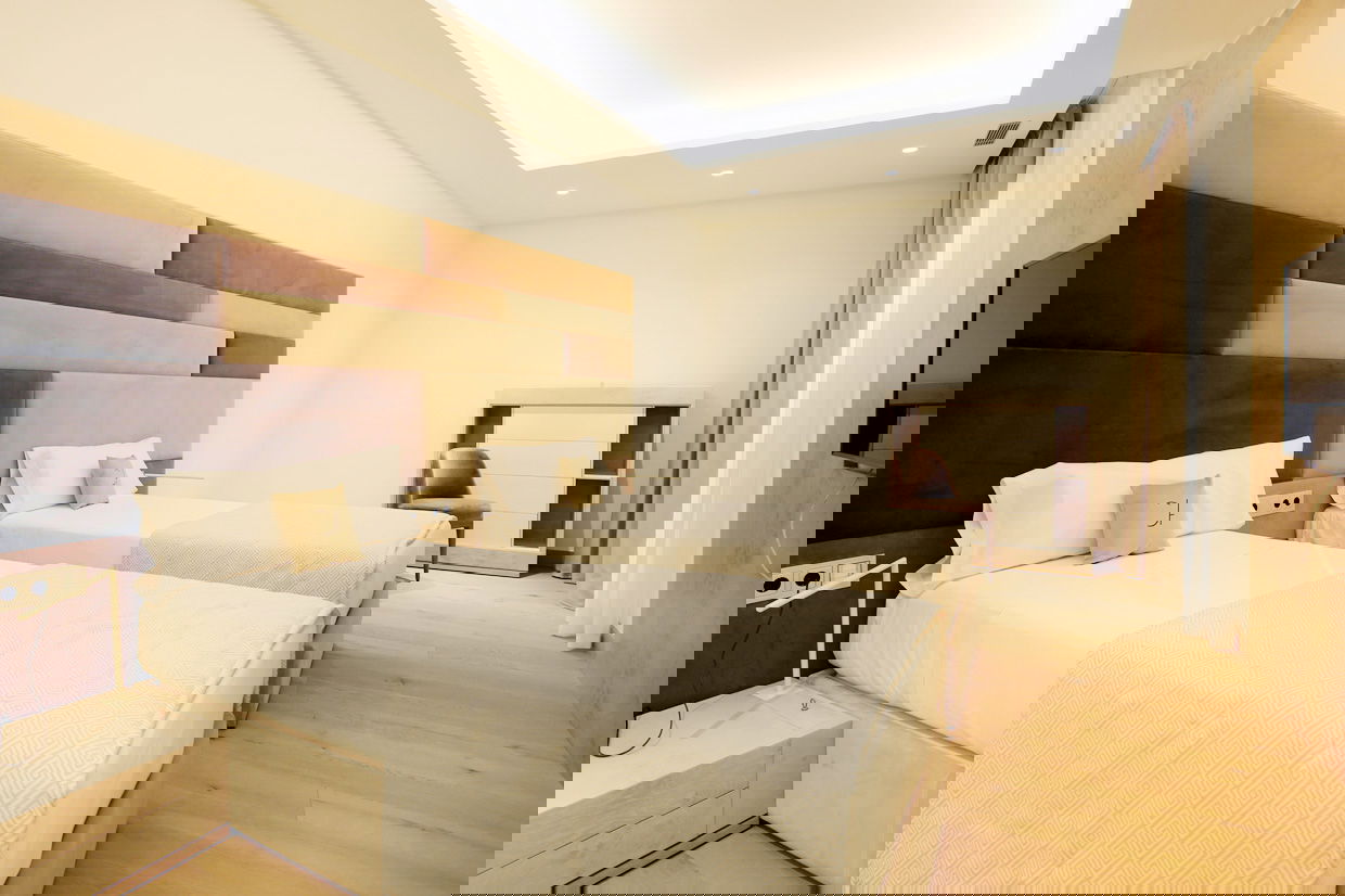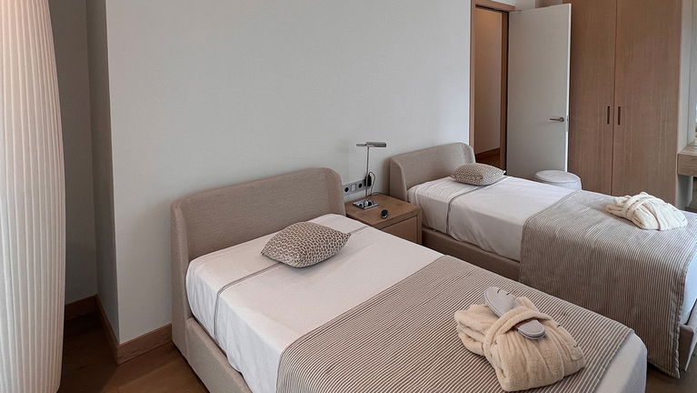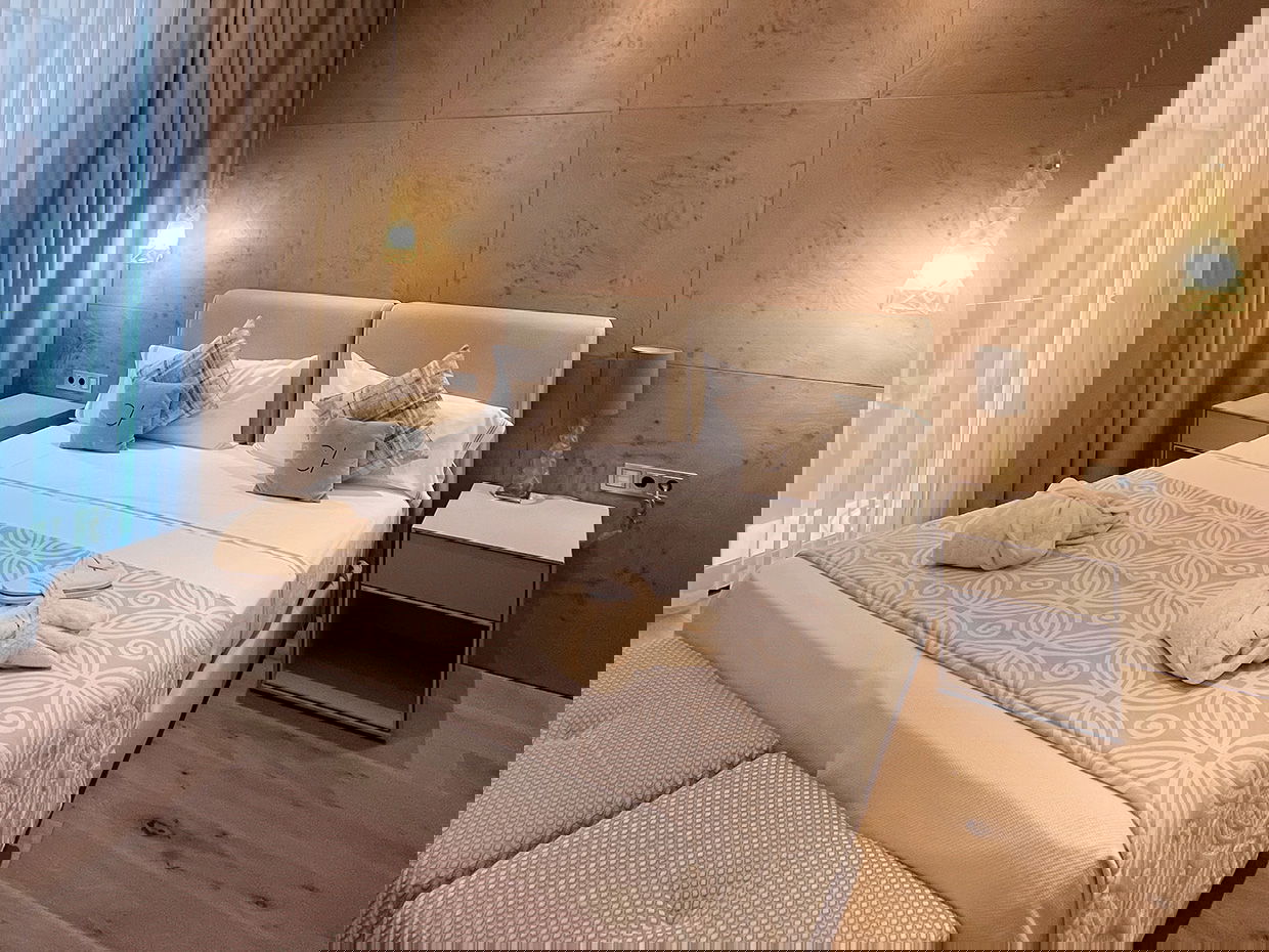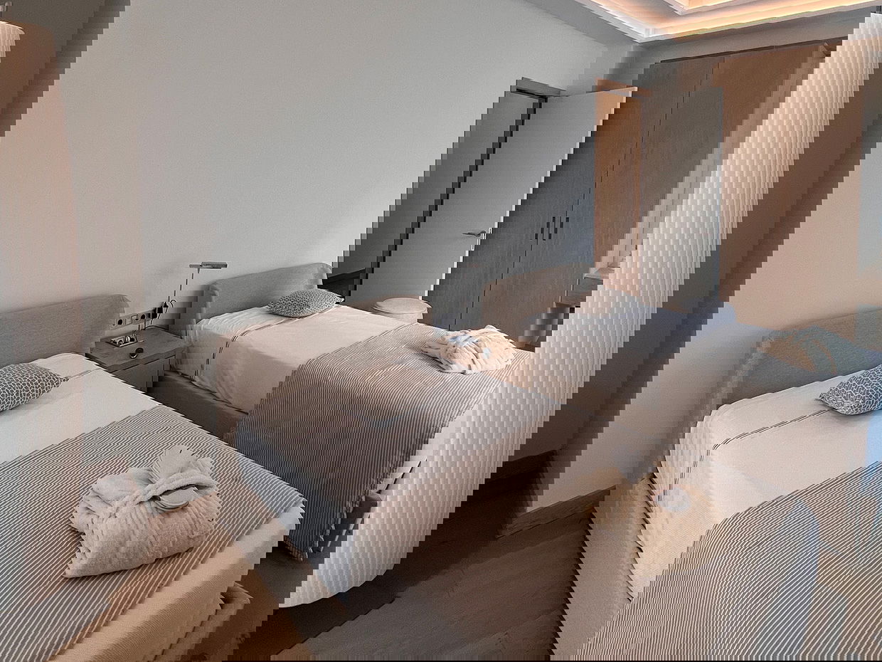 Modern and spacious three-bedroom apartments (112–120 m²) with a living room, kitchen, and two bathrooms. One bedroom has twin beds, one has a double bed, and the master bedroom features a double bed, en-suite bathroom with shower and bathtub, and a dressing room. Accommodates up to 6 guests.