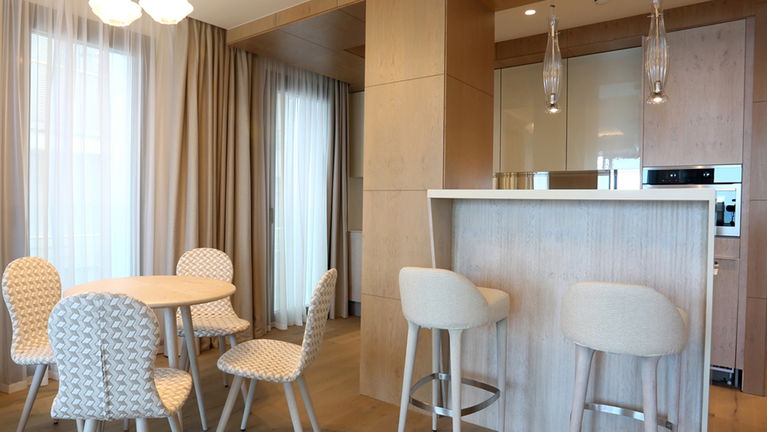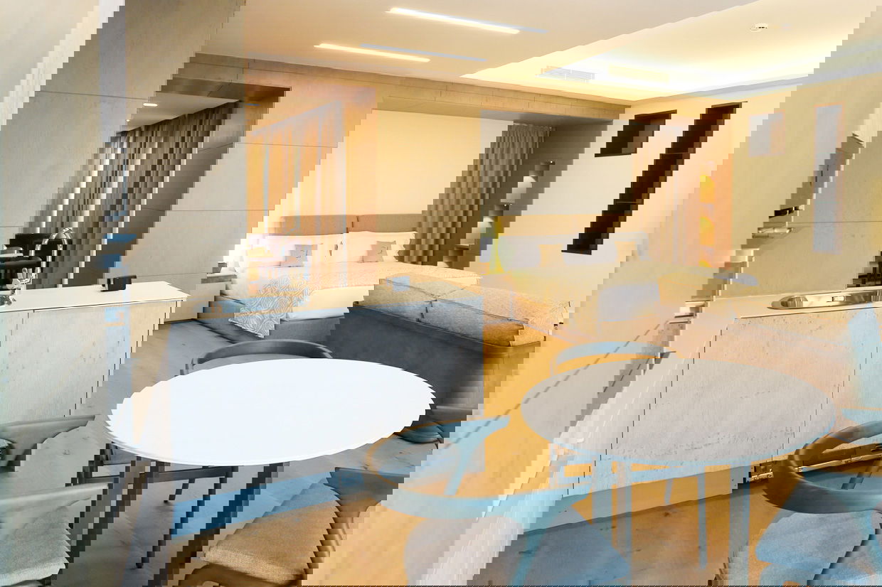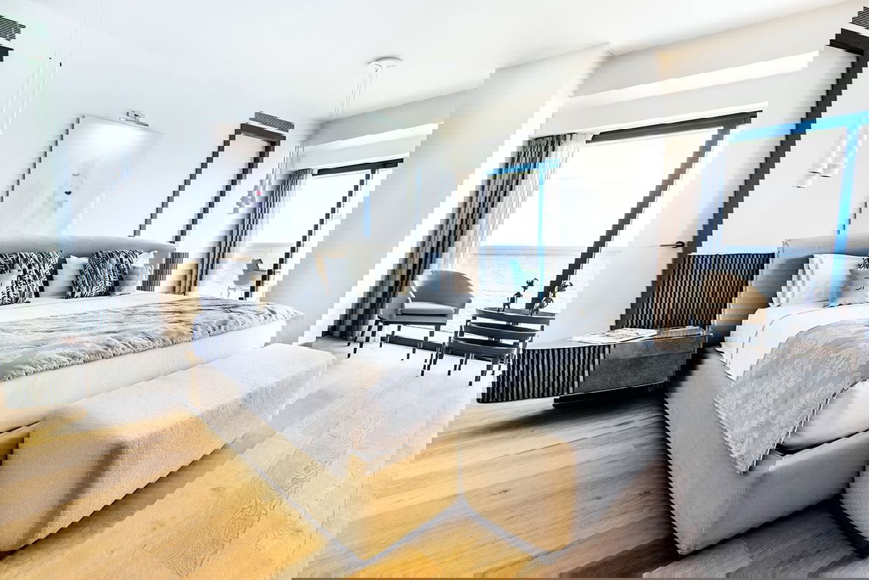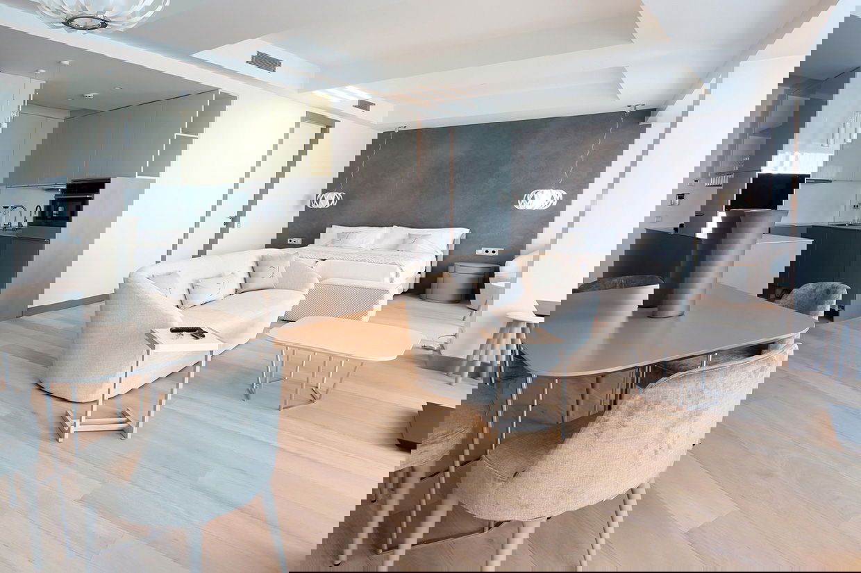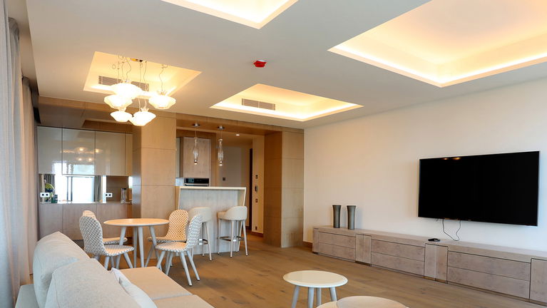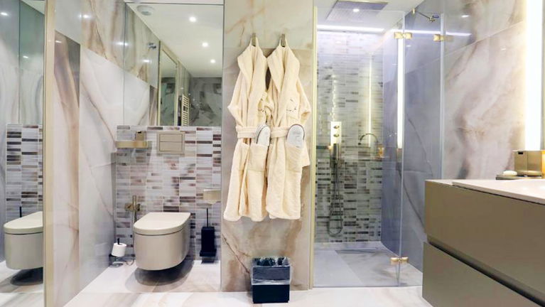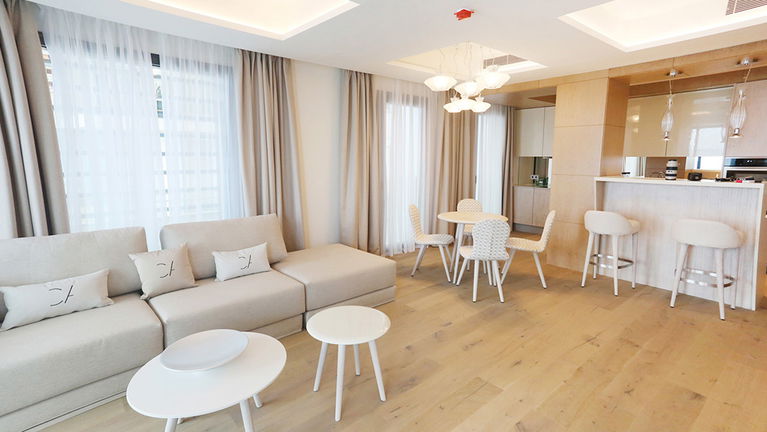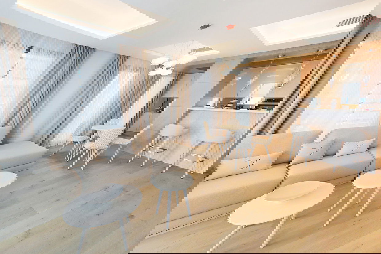 Modern and spacious three-bedroom apartments (112–120 m²) with a living room, kitchen, and two bathrooms. One bedroom has twin beds, one has a double bed, and the master bedroom features a double bed, en-suite bathroom with shower and bathtub, and a dressing room. Accommodates up to 6 guests.
