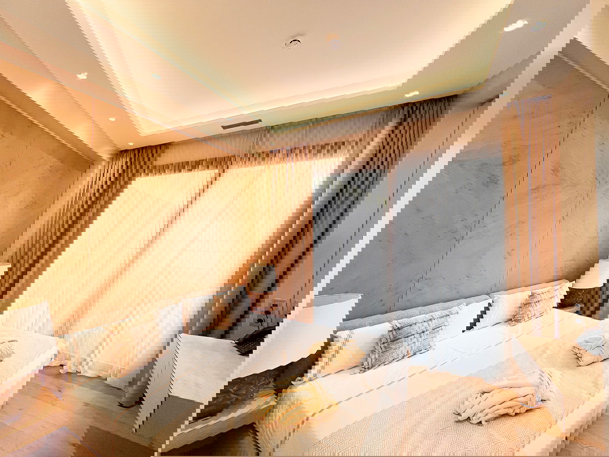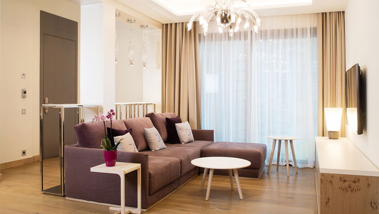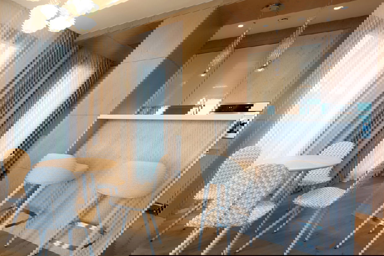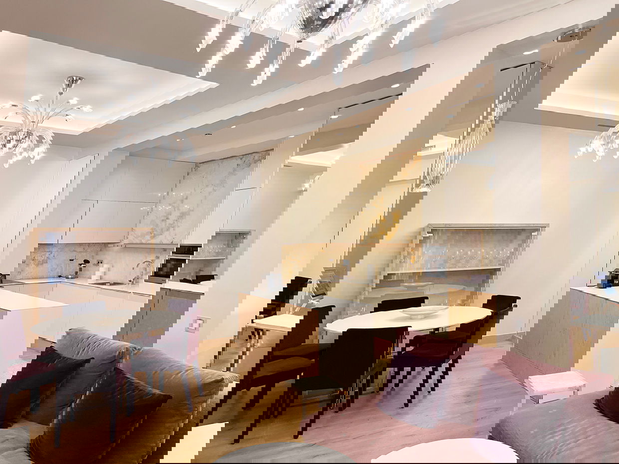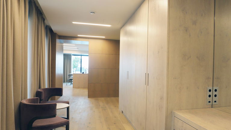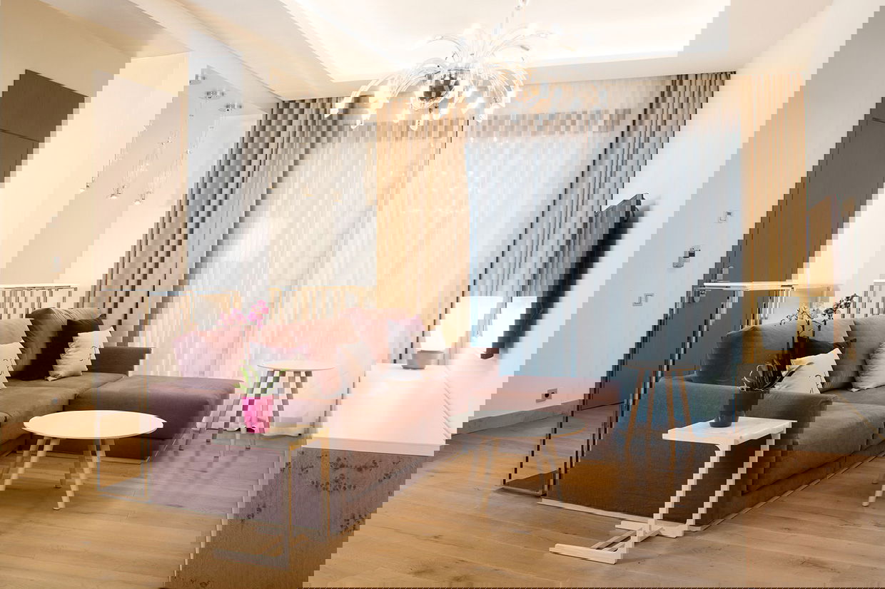 Modern and spacious three-bedroom apartments (112–120 m²) with a living room, kitchen, and two bathrooms. One bedroom has twin beds, one has a double bed, and the master bedroom features a double bed, en-suite bathroom with shower and bathtub, and a dressing room. Accommodates up to 6 guests.