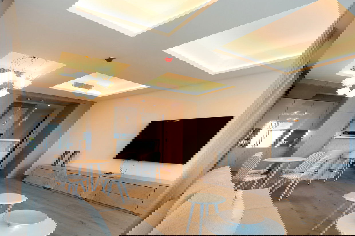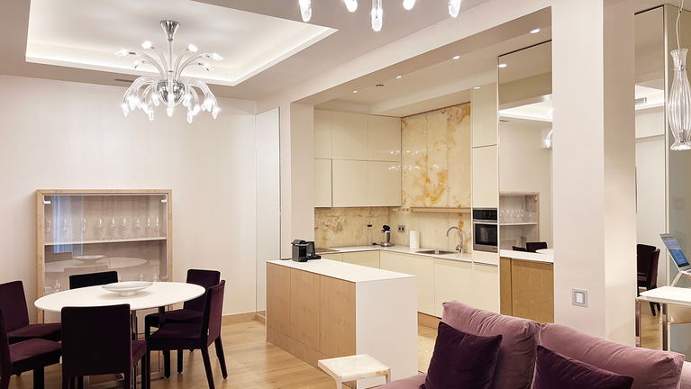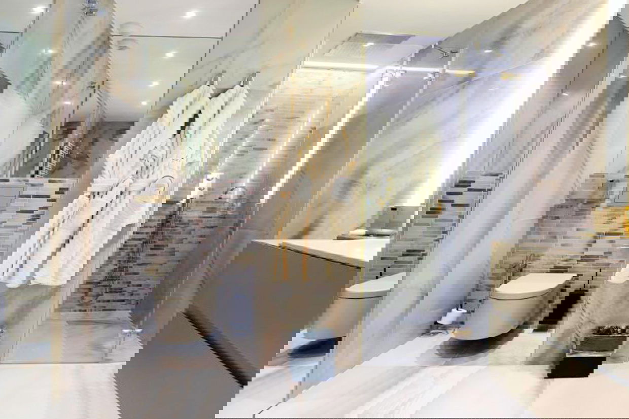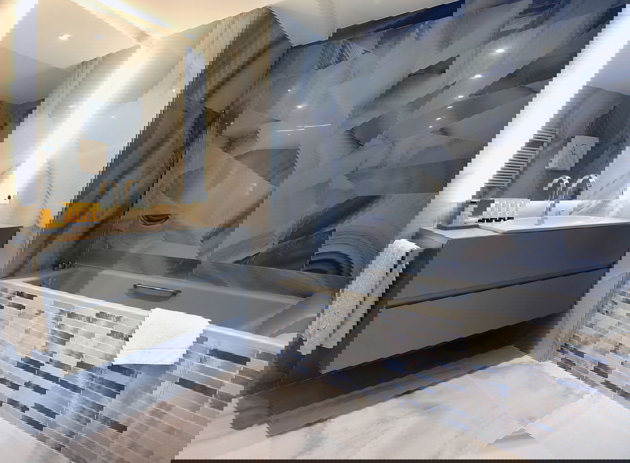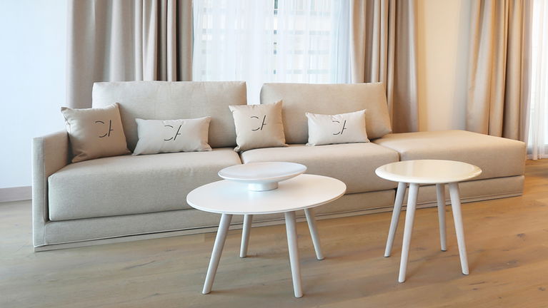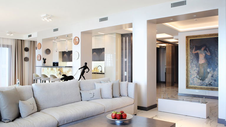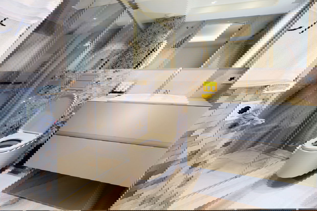 Modern and spacious three-bedroom apartments (112–120 m²) with a living room, kitchen, and two bathrooms. One bedroom has twin beds, one has a double bed, and the master bedroom features a double bed, en-suite bathroom with shower and bathtub, and a dressing room. Accommodates up to 6 guests.