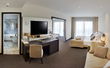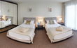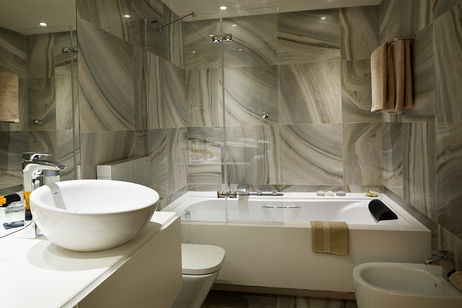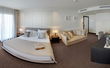 40 m² family room for up to 4 guests (2 adults + 2 children), with two connected rooms: one with extra-large double bed, the other with two single beds. Bathroom with bathtub, Wi-Fi, flat-screen TV, minibar, desk and seating area. Partial sea view. No extra beds available.