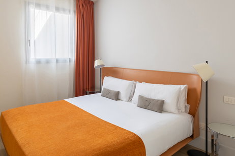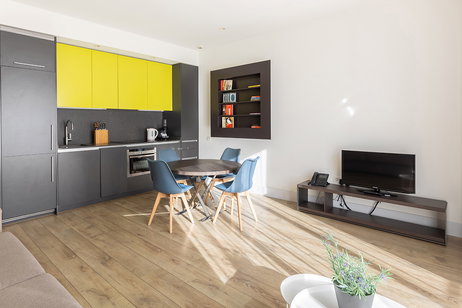 Modern 50 m² one-bedroom apartment with a queen-size bed and a double sofa bed in the living room. Accommodates up to 4 guests. Features an open-plan kitchen, bright dining area, flat-screen TV, air conditioning, and either a balcony or small terrace. A stylish and comfortable space for a relaxing stay.