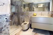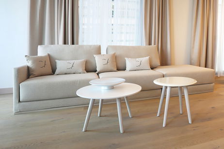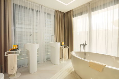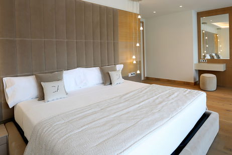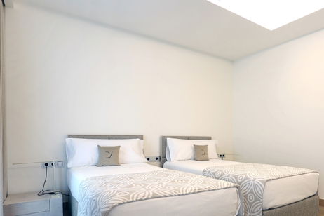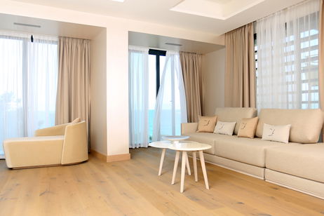 Spacious two-bedroom apartments (115–120 m²) with two private terraces, one offering stunning sea views. Includes a living room with kitchen, one bedroom with twin beds and private bathroom, and a master bedroom with a double bed, en-suite bathroom (shower & bathtub), and dressing room. Ideal for up to 4 guests.